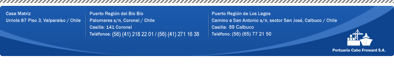 | PORTUARIA CABO FROWARD S.A. comienza sus actividades el año 1994. Pertenece al Holding de Grupo Empresas Navieras S.A., al cual están ligadas la Compañía Marítima Chilena S.A (CMC) , Agencias Universales – AGUNSA, Empresas Marítimas S.A. - CPT, entre otras importantes compañías del rubro marítimo portuario.
