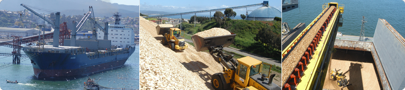 El embarque de astillas se efectúa a través de un sistema mecanizado de correas transportadoras que llevan el producto desde las canchas a los muelles Puchoco y Jureles; la estiba y el trimado se realizan mediante cargador de naves con brazo pivoteable, Jet Slinger y máquinas del tipo cargador frontal, logrando de esta manera los mejores rendimientos de transferencia y compactación de las cargas, lo que optimiza la relación costo/flete de las naves y con ello mejora la competitividad de los exportadores.